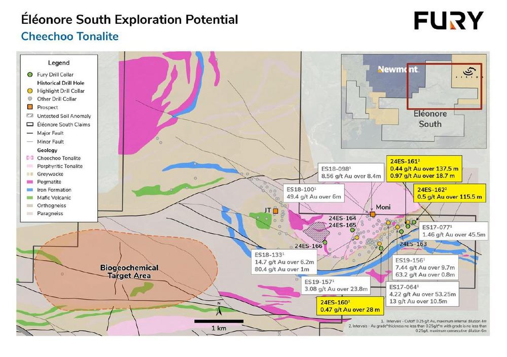 Fury Gold Mines Limited (TSX und NYSE American: FURY) ("Fury" oder das "Unternehmen") https://www.commodity-tv.com/ondemand/companies/profil/fury-gold-mines-ltd/ – freut sich, die Ergebnisse seines Diamantkernbohrprogramms vom Frühjahr 2024 auf seinem zu 100 % unternehmenseigenen Goldprojekt Éléonore South im Gebiet Eeyou Istchee in der Region James Bay in Quebec bekannt zu geben. Das Diamantbohrprogramm im Frühjahr 2024 umfasste 2.331,4 Meter (m) in sieben Diamantbohrlöchern, die einen 2,3 Kilometer (km) langen Streich entlang des Trends JT – Moni erprobten. Die Bohrungen zielten auf 100 bis 125 m neigungsabwärts gelegene Erweiterungen der historischen Bohrungen ab. Alle sieben Bohrlöcher durchschnitten eine anomale Goldmineralisierung, einschließlich 137,5 m mit 0,44 g/t Gold und 18,7 m mit 0,97 g/t aus Bohrloch 24ES-161, 115,5 m mit 0,50 g/t Gold aus Bohrloch 24ES-162 und 28,0 m mit 0,47 g/t Gold aus Bohrloch 24ES-160 (Abbildung 1 und Tabelle 1). Die abgeschlossenen begrenzten Bohrungen bestätigen, dass die Goldmineralisierung innerhalb des Tonalits Cheechoo weiterhin offen ist.