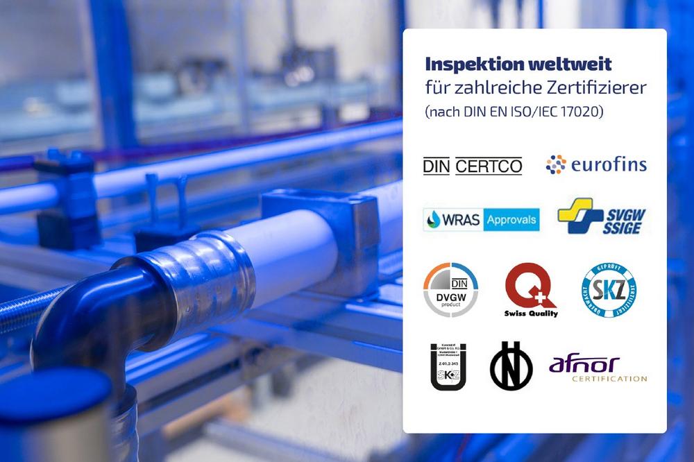 Die Inspektoren des Kunststoff-Zentrums SKZ auditieren weltweit Produktionsstätten von Unternehmen, die diverse Rohrsysteme produzieren. Dabei führen sie Produktüberwachungen (nach DIN EN ISO/IEC 17020) für nahezu alle renommierten Zertifizierungs-Firmen für Trinkwasser-/Abwasser, Heizungs-/Gas- Anwendungen durch.