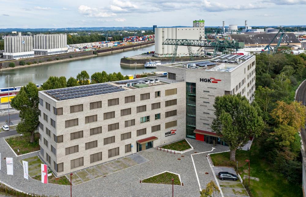 Mit einer Fläche von 1,4 Quadratkilometern zählt der 1925 eröffnete Güterhafen in Köln-Niehl zu den größten Binnenhäfen in Nordrhein-Westfalen. Im nördlichen Bereich des Hafens, direkt angrenzend an die Hafeneinfahrt und den Westkai, am Knotenpunkt von Boltensternstraße, Niehler Damm und Industriestraße, hat jetzt die Häfen und Güterverkehr Köln AG (HGK) ihr neues Domizil bezogen. Der markant gestaltete Klinkerbau fasst die bislang über das ganze Stadtgebiet verteilten Niederlassungen des Logistikkonzerns unter einem Dach zusammen und stellt dem Unternehmen auf fünf bzw. sechs Ebenen eine flexibel nutzbare Bürofläche von 8.500 Quadratmetern für bis zu 270 Mitarbeiter zur Verfügung.
