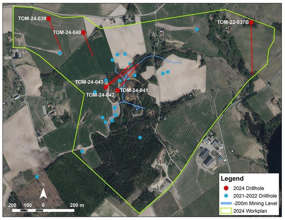 A total of 2,196 m in six drill holes was completed during this drill program that was carried out from mid-February to mid-April 2024 as part of the collaboration with Boliden Mineral AB. Strong footwall copper-rich polymetallic sulphide mineralization has been encountered at the Steffenburgs zone of the historic Tomtebo Mine (April 29, 2024 news release).