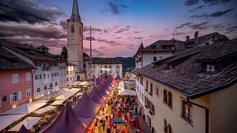 Auf dem Marktplatz des Weinortes werden wieder Zelte mit weinrotem Dach stehen, in denen Weine zur Verkostung ausgeschenkt werden. Dazwischen kann man an Essenständen regionale Spezialitäten verkosten, wie Südtiroler Speck, Käse oder Apfelkiachln.