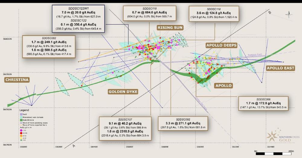 • SDDSC122W1 intersected two high-grade vein sets in a 150 m down-dip step out at Rising Sun below SDDSC082 (1.7 m @ 249.2 g/t AuEq and 1.6 m @ 500.5 g/t AuEq). It included ten assayed intervals of > 10 g/t Au (up to 102.0 g/t Au), and three assayed intervals > 5% Sb (up to 21.4% Sb). Selected highlights include: