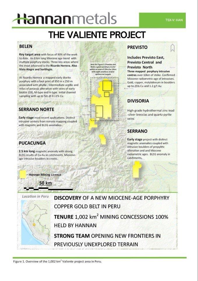 The 100% owned Valiente project is in central eastern Peru, east of the city of Tingo Maria (Figures 1 and 2). The area is characterized by steep topography on the eastern flank of the Central Cordillera with elevations between 800 m and 2,000 m above sea level (a.s.l.). The project was discovered in 2021 during an extensive mineral prospecting exploration program initiated by Hannan for back-arc porphyry copper-gold systems. The Company has been actively exploring the project since 2021 and has successfully gained social permits progressively in all areas of interest.