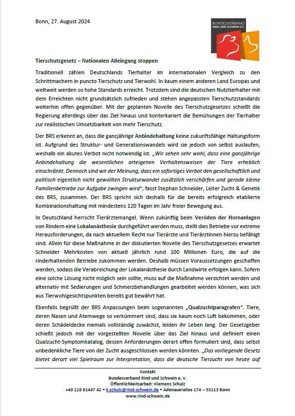 Ebenfalls begrüßt der BRS Anpassungen beim sogenannten „Qualzuchtparagrafen“. Tiere, deren Nasen und Atemwege so verkümmert sind, dass sie kaum noch Luft bekommen, oder deren Schädeldecke niemals vollständig zuwächst, leiden ihr Leben lang. Der Gesetzgeber schießt jedoch mit der vorgestellten Novelle über das Ziel hinaus und definiert einen Qualzucht-Symptomkatalog, dessen Anforderungen derart offen formuliert sind, dass selbst unbedenkliche Tiere von der Zucht ausgeschlossen werden könnten. „Das vorliegende Gesetz bietet derart viel Spielraum zur Interpretation, dass die deutsche Tierzucht von heute auf morgen auf Eis gelegt werden kann“, befürchtet Schneider. Dabei kann gerade die Zucht zum wertvollen Verbündeten des Tierschutzes werden, denn die vom Staat anerkannten Zuchtbücher der zugelassenen Rinder-, Schweine-, Ziegen- und Schafzuchtorganisationen arbeiten grundsätzlich mit dem Ziel, genetische Auffälligkeiten aus den in den Zuchtbüchern geführten Populationen zu eliminieren. Der Qualzuchtparagraf sollte eben gerade im Sinne des Tierschutzes für etablierte Zuchtbücher und die in ihnen geführten Rassen nicht gelten. Die Schweine- und Rinderzuchtverbände sowie die Zuchtorganisationen haben bereits in der Vergangenheit große Anstrengungen unternommen, Gesundheits- und Tierschutzaspekte als zentrale Eckpfeiler ihrer Zuchtprogramme zu etablieren und dabei enorme Fortschritte im Sinne des Tierwohls erzielt. Diese Fortschritte müssen auch weiterhin möglich sein.