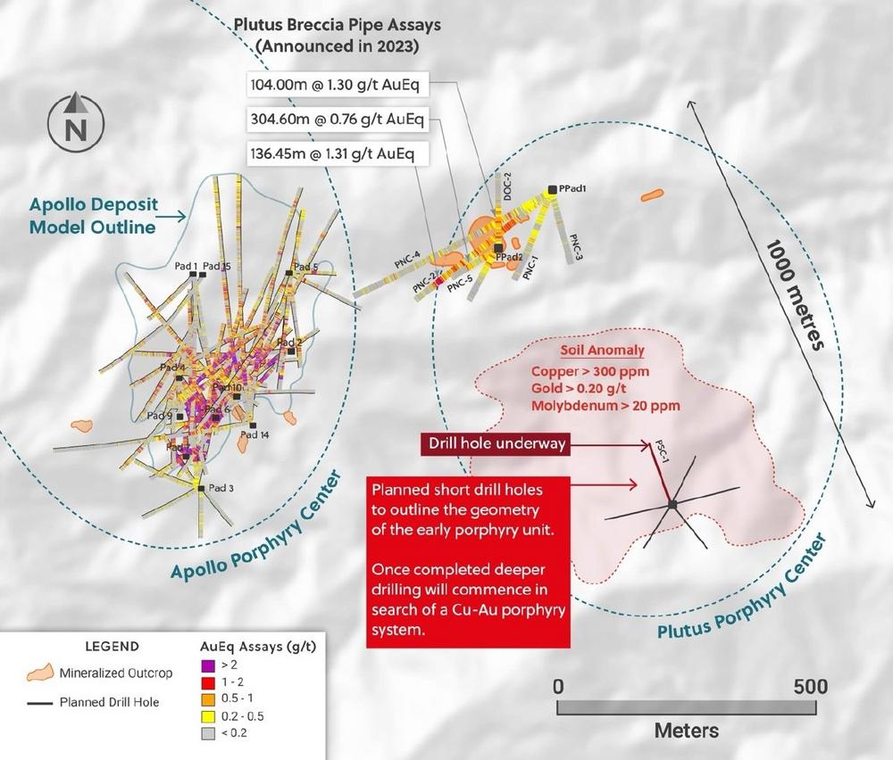 • Das Ziel Plutus, das etwa 1.000 Meter östlich von Apollo liegt, misst eine Fläche von 1.000 mal 750 Metern und ist in alle Richtungen offen. Bisher wurden bei Plutus zwei Ziele umrissen: ein unerprobtes Kupfer-Gold-Porphyr-Ziel im Süden und ein Brekzienrohr-Ziel im Nordwesten. Frühere Untersuchungsergebnisse von Bohrungen im Jahr 2023 im Brekzienrohr-Ziel im Nordwesten ergaben mehrere breite Abschnitte, einschließlich 136,45 Meter mit 1,31 g/t AuEq (siehe Pressemitteilung vom 11. Oktober 2023).