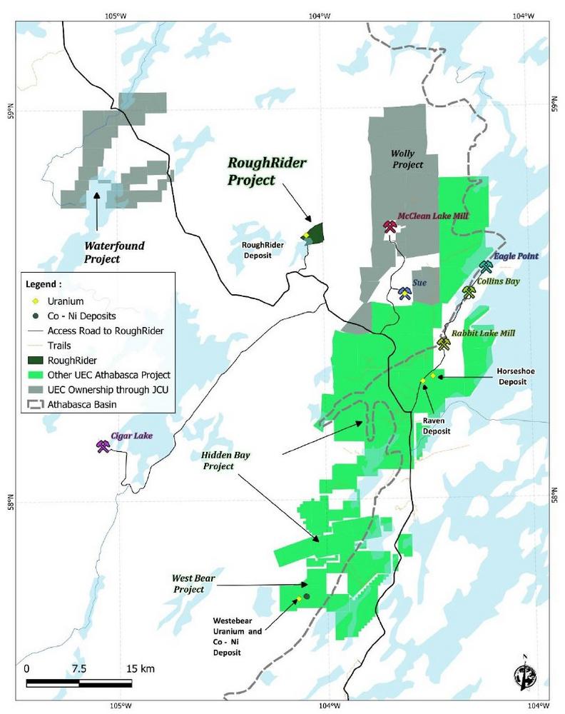 The Roughrider Project is a uranium project located in the eastern Athabasca Basin of northern Saskatchewan, Canada; one of the world’s premier uranium mining jurisdictions. The Project is located approximately 13 kilometres west of Orano’s McClean Lake Mill, near UEC’s existing Athabasca Basin properties. The depth to mineralization at the project is approximately 200 metres and hosted primarily in the basement rocks below the unconformity.