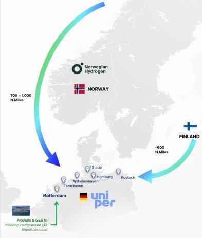 Provaris und Norwegian Hydrogen arbeiten gemeinsam an der Entwicklung von Standorten, die für die Versorgung mit RFNBO-konformem Wasserstoff geeignet sind. Die Speicherung und der Transport von Wasserstoff erfolgen über die H2Leo-Speicherschiffe und die H2Neo-Frachtschiffe von Provaris. Derzeit wird daran gearbeitet, die bevorzugten Standorte in den nordischen Ländern, einschließlich Norwegen und Finnland, festzulegen. Zu den Standorten mit einer detaillierten Machbarkeitsstudie zählt auch das Projekt FjordH2 in der Region Alesund in Norwegen.