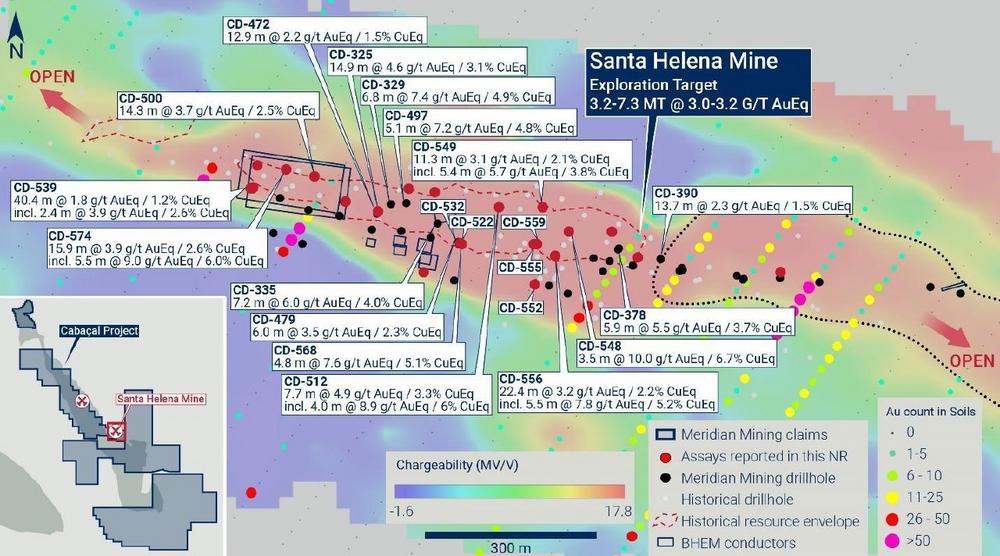 Die Bohrungen bei Santa Helena lieferten einen stetigen Fluss von Gold-, Kupfer-, Silber-, Zink- und einigen Bleimineralisierungen und konsolidierten den Fußabdruck der westlichen, zentralen und östlichen Sektoren der Lagerstätte. Die Geometrie, die Tiefe, die Kontinuität und die robusten Gehalte der bisherigen Mineralisierung deuten darauf hin, dass das Potenzial von Santa Helena, offene, förderbare Ressourcen zu beherbergen, weiterhin gegeben ist. Die Bohrungen werden fortgesetzt, um die westliche Grenze der Lagerstätte zu charakterisieren, wo CD-574 auf 58,2 m 15,9 m mit 3,9 g/t AuEq / 2,6 % CuEq ergab, einschließlich eines höhergradigen Kerns von 5,5 m mit 9,0 g/t AuEq / 6,0 % CuEq auf 60,1 m.