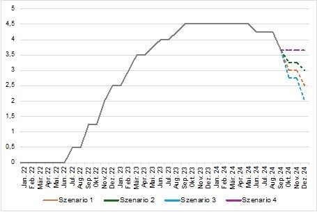 Der EZB-Rat trifft sich noch zwei Mal in diesem Jahr, um geldpolitische Beschlüsse zu fassen. Angenommen die EZB setzt das derzeitige Tempo fort, könnte damit der Leitzins bis zum Ende des Jahres auf das Niveau von ca. 2,5 fallen (Vgl. Abbildung 1, Szenario 1). Wie realistisch dieses Szenario ist, hängt unter anderem von der Inflationsentwicklung ab. Im August lag die jährliche Inflation in der Eurozone bei 2,2 Prozent. Im Juli waren es noch 2,6 Prozent. Der Abwärtstrend könnte aber eine kleine Atempause einnehmen, da die EZB erwartet, dass „die Inflation im letzten Teil des laufenden Jahres wieder ansteigen wird. Dies ist zum Teil darauf zurückzuführen, dass vorangegangene starke Rückgänge der Energiepreise aus den Jahresraten herausfallen werden.“ Demnach könnte die EZB den Fuß etwas vom Gas nehmen und weitere Zinssenkungen aussetzen oder lediglich im Umfang von 25 Basispunkte tätigen (Szenario 2). Letzteres käme einem Leitzins von drei Prozent bis zum Ende des Jahres gleich, welches das wahrscheinlichste Szenario zu sein scheint.