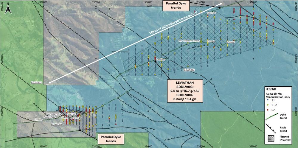 Frühere regionale Bohrungen (ASX-Meldung vom 12. Oktober 2023), die bis zu 8 km entlang des Streichs des Hauptbohrgebiets bei Sunday Creek durchgeführt wurden, bestätigten das Vorhandensein desselben Dyke-Brekzien-Grundgebirges und quer verlaufender hochgradiger goldhaltiger Adern, die derzeit innerhalb der mineralisierten Hauptzone erbohrt werden. Diese Ergebnisse entsprachen den sehr frühen Bohrungen, die im heutigen Kernbohrgebiet bei Sunday Creek durchgeführt wurden. Hochgradiges Gold mit anomalem und breitem (150 m) mineralisiertem Halo wurde entdeckt, einschließlich 0,5 m mit 15,7 g/t Au auf 87,0 m (einschließlich sichtbarem Gold) in SDDLV003 auf dem Grundstück Leviathan.
