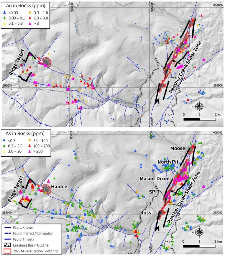 Note: 1Beartrack-Arnett Project compilation of rock geochemistry. Rock chip chemistry includes samples taken throughout the history of the project and include 107 rock samples press released on November 13th, 2017, 144 samples taken between 2019 and 2024, and 434 historic rock samples digitized from document archives. Samples include both representative chip samples and historic mine dump samples and may not be representative of in-situ mineralization.