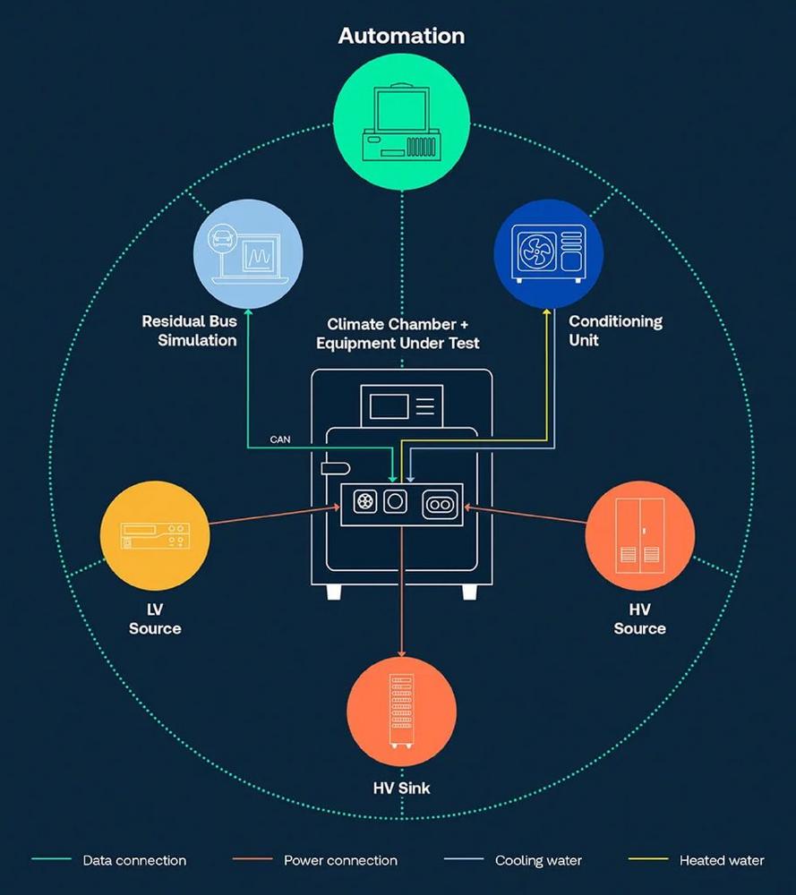 The HV testing scheme comprises testing of HV components under simulated environmental conditions in accordance with standards including LV123, LV124, LV148, and further customer-specific standards. The tests provide proof that the high-voltage components are able to function efficiently and comply with ultra-strict safety requirements. They include: