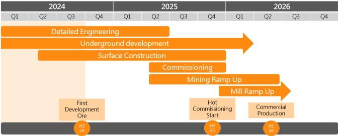 The project remains on schedule to start hot commissioning in H2/25 and commercial production in H1/26. The project’s main critical path activities include installation of the primary structural steel and cladding for the mill, installation of the SAG mill and Ball mill, installation of the copper and zinc flotation circuits and commissioning and the ramp up to commercial production.