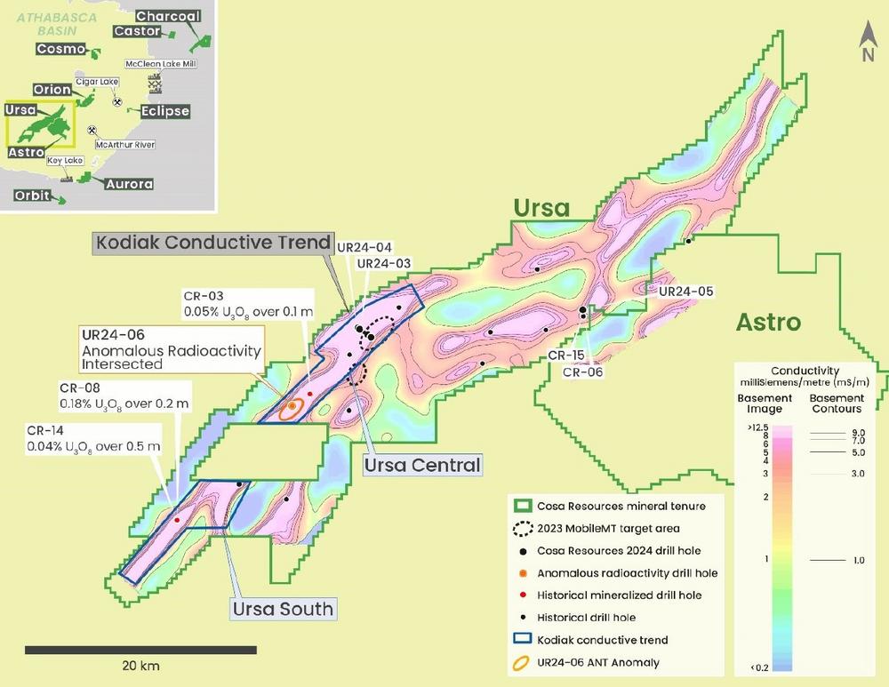 Keith Bodnarchuk, President und CEO, kommentierte: "Mit dem erst zweiten Bohrprogramm auf einem Projekt, das mehr als 65 Kilometer unerforschte, leitfähige Streichlänge umfasst, haben wir den Kodiak-Trend und das Projekt Ursa als Ganzes erheblich aufgewertet. Die Durchschneidung der östlichen Athabasca-inkonformen Sandsteinalteration, die von mehreren Zonen mit Radioaktivität im Grundgestein unterlagert ist, in Bohrloch UR24-06 ist ein bedeutender Erfolg für unser technisches Team und ein überzeugender Beweis für die Aussichten in der Cable Bay Shear Zone. Der stark graphithaltige Grundgebirgsleiter, der von UR24-04 etwa 9 Kilometer nordöstlich von UR24-06 und auf dem Kodiak-Trend durchteuft wurde, deutet darauf hin, dass eine bedeutende strukturelle Unterbrechung und hydrothermale Alteration, die für das Diskordanzmodell typisch ist, über viele Kilometer auf dem Projekt fortbestehen könnte. Die moderne geophysikalische Erfassung hat sich als lohnende Investition bei Ursa erwiesen, und wir haben uns noch nie so sehr darauf gefreut, für Nachfolgebohrungen in der Nähe dieser Ergebnisse zurückzukehren und weitere kilometergroße ANT-Anomalien zu evaluieren."
