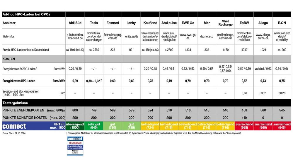 Um den unterschiedlichen Ladegewohnheiten gerecht zu werden, hat connect drei Nutzerprofile erstellt: „Laternenparker“, „Durchschnittslader“ und „Vielfahrer“. Der Nutzertyp „Laternenparker“ ist vollständig auf das öffentliche Laden angewiesen und spart mit günstigen Tarifen am meisten. Hier setzt sich EWE Go als Testsieger durch, gefolgt von Mercedes und E.ON – alle drei erhalten die Note „sehr gut“.