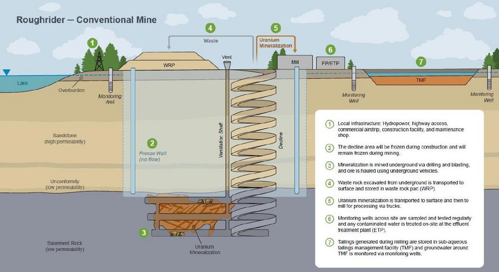 Ground freezing will be used to control water inflows into the main decline to a depth below the unconformity as well as into the three mining zones. Freeze wells will be installed from surface around the perimeter of each zone with active freezing starting at least 12 months prior to mining. Figure 1 was generated by UEC as a conceptual image of the conventional underground mine. Further details of proposed mining and milling methods are set out in the Technical Report Summary.