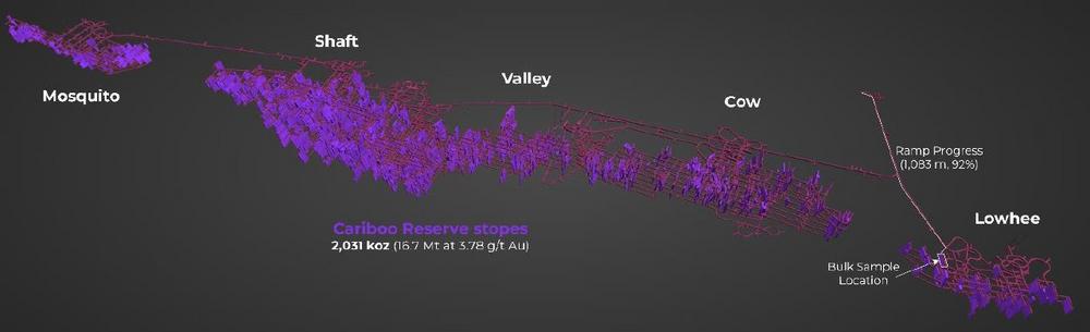 In Q1 2024, under an existing provincial permit, the Company commenced an underground development drift from the existing Cow Portal into the Cariboo Gold Project’s mineral deposit at the Lowhee Zone. The objective of the bulk sample work program is to develop into the ore body and extract a 10,000 tonne bulk sample of mineralized material for mining, ore sorting and processing testing.