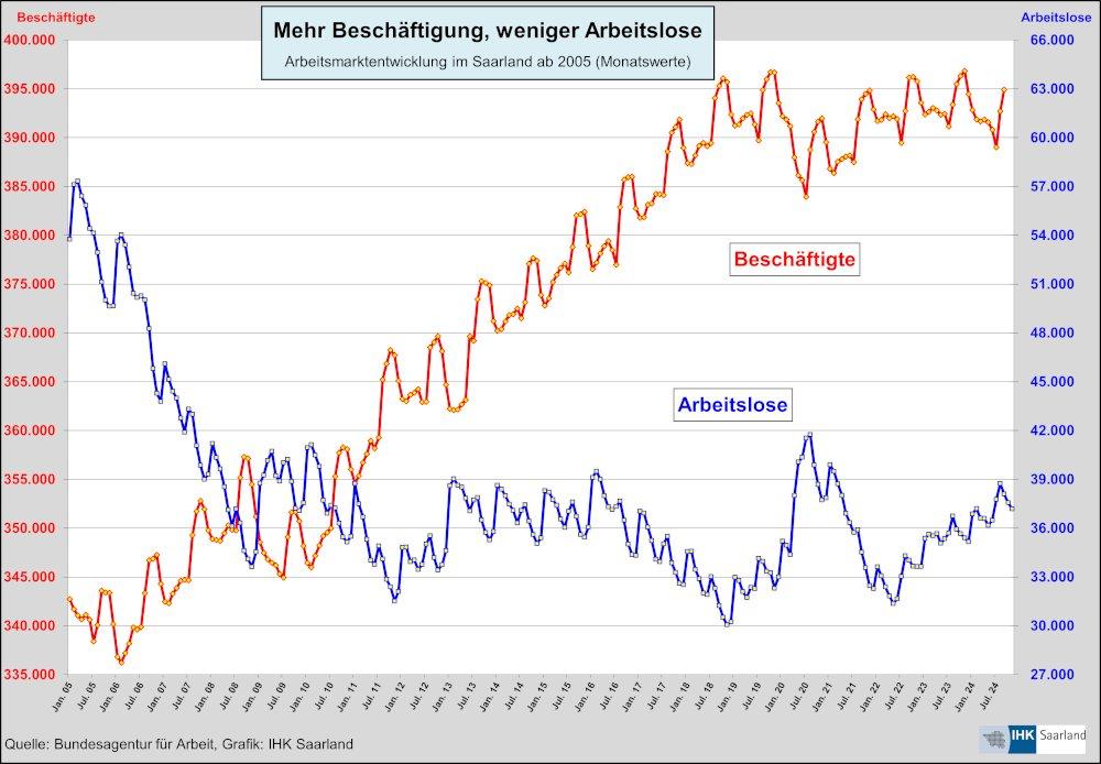 Die Zahl der sozialversicherungspflichtig Beschäftigten an der Saar ist im September gegenüber August (neuere Daten liegen noch nicht vor) weiter gestiegen (+2.200), auf 394.900 Stellen. Dennoch liegt das derzeitige Beschäftigungsniveau gegenüber September 2023 im Minus (-598). Das entspricht einem Beschäftigungsverlust von -0,2 Prozent im Jahresvergleich. Das ist nunmehr bereits der achte Rückgang in Folge, während der Beschäftigungsaufwuchs im langjährigen Mittel im Saarland immer noch +0,5 Prozent beträgt. Das ist bedenklich, denn es signalisiert unverkennbar eine Trendwende bei der Beschäftigungsentwicklung hierzulande. Im aktuellen Länderranking der Beschäftigungsentwicklung liegt das Saarland weiter auf dem viertletzten Platz. Schlechter schneiden aktuell nur Thüringen, Sachsen-Anhalt und Mecklenburg-Vorpommern ab. In allen diesen Bundesländern war die Beschäftigung – wie außerdem noch in Bremen – rückläufig. Das erklärt auch, dass im Bund der Beschäftigungszuwachs mittlerweile ebenfalls deutlich abflaut. Der Bundesdurchschnitt liegt aktuell nur noch bei +0,3 Prozent und damit inzwischen weit unter dem langjährigen Bundesschnitt von +1,4 Prozent.