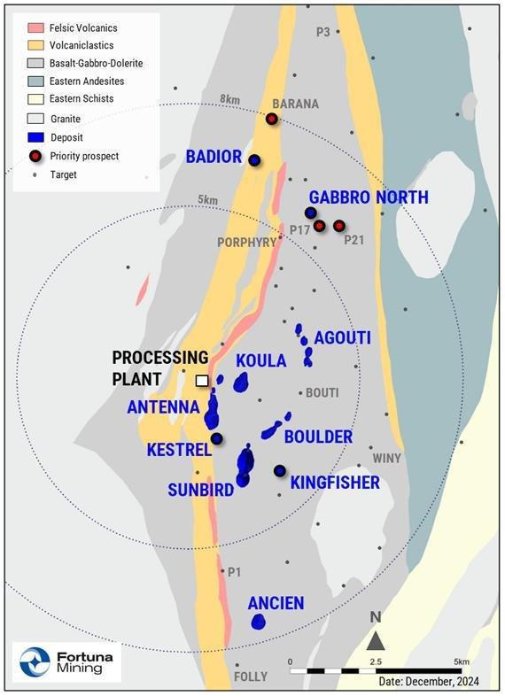 A further 58 holes totaling 11,103 meters were completed at the Kingfisher deposit since early September 2024 (refer to Figure 1), of which 16 holes totaling 3,286 meters were drilled subsequent to the maiden Inferred Resource data cut-off date (refer to Fortuna news release dated December 10, 2024). Kingfisher remains open at depth for most of the drilled 2-kilometer strike, with the deepest drilling only testing to approximately 250 meters below surface (refer to Figure 2).