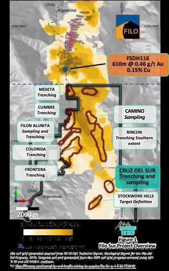 Mogotes Metals sieht sich durch dieses Bohrloch ermutigt, das zu den hochgradigsten Bohrlöchern im Süden des Filo del Sol zählen würde und bestätigt, dass der nord-südlich ausgerichtete Vicuna-Trend der Cu-Au-Ag-Mineralisierung nach Süden offen bleibt und in das Projekt Filo Sur hineinragt und das Ziel Mogotes Meseta umfasst.