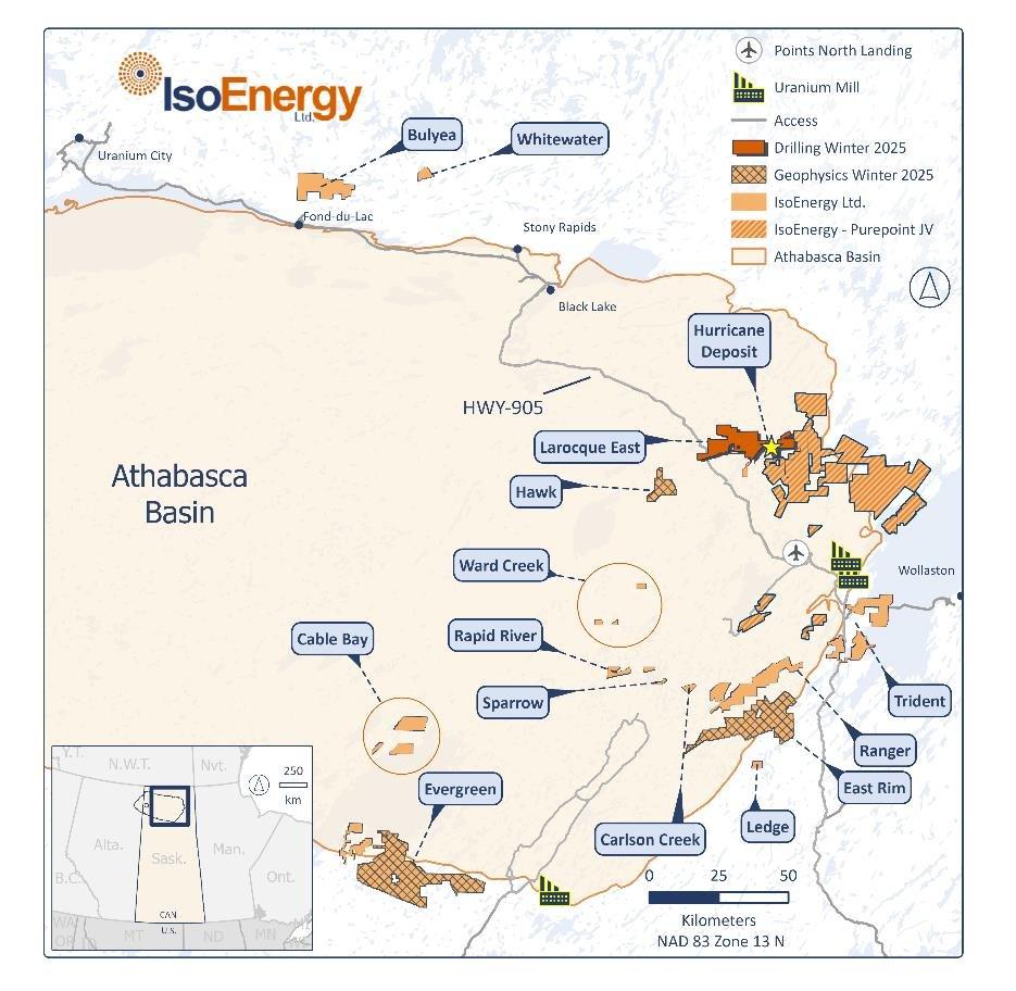 IsoEnergy Ltd. ("IsoEnergy" oder das "Unternehmen") (TSX: ISO; OTCQX: ISENF) https://www.commodity-tv.com/ondemand/companies/profil/isoenergy-ltd/ – freut sich, den Beginn seines Winterexplorationsprogramms 2025 im östlichen Athabasca-Becken, Kanada (Abbildung 1), bekannt zu geben, das auf der erfolgreichen Saison 2024 des Unternehmens aufbauen soll. Auf dem Projekt Larocque East, das die hochgradige Lagerstätte Hurricane enthält, sind Bohrungen über insgesamt 8.800 Meter geplant, wobei die Mobilisierung zum Projekt bereits im Gange ist. Der Schwerpunkt des Programms liegt auf der Erkundung des Potenzials für eine Ressourcenerweiterung in der Nähe der Lagerstätte Hurricane sowie auf der Evaluierung von neuen Zielen entlang des Larocque-Trends (Larocque Trend") östlich von Hurricane. Geophysikalische Untersuchungen sind auch bei den Projekten Hawk, Evergreen und East Rim geplant, um diese Projekte, die sich noch in einem frühen Stadium befinden, bis zur Bohrreife zu bringen. Für die Winterexplorationsprogramme im Athabasca Basin wurde ein Gesamtbudget von 5,3 Millionen $ genehmigt.