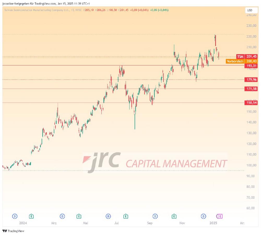 Der gestrige Aktienkurs von TSMC zum Börsenschluss lag bei 201,45 US-Dollar, heute steht er mit vorbörslichen 200 US-Dollar etwas niedriger. Die Aktie befindet sich noch in einem stabilen Aufwärtstrend. Allerdings könnte im Zuge der morgigen Quartalsergebnisse Volatilität aufkommen.