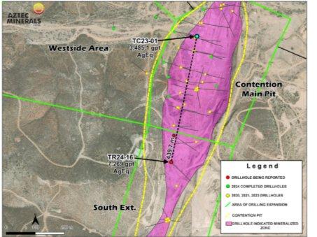 Die primären Ziele des Bohrprogramms waren: Erweiterung der bekannten Mineralisierung horizontal in Richtung Westen, Norden und Süden und im Einfallen über die 2020-23 von Aztec in der Grube Contention niedergebrachten Bohrlöcher hinaus, mit Stepout-Bohrungen zur Erweiterung der flachen, breiten Gold-Silber-Mineralisierung mit großer Tonnage, die dort entdeckt wurde; außerdem sollten mit First-Pass-Bohrungen neue Ziele im Gebiet Westside identifiziert werden.