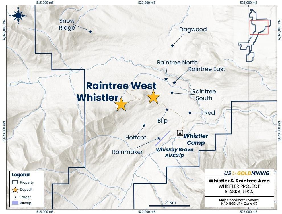 U.S. GoldMining Inc. is an exploration and development company focused on advancing the 100% owned Whistler Gold-Copper Project, located 105 miles (170 kilometers) northwest of Anchorage, Alaska, U.S.A. The Whistler Project consists of several gold-copper porphyry deposits and exploration targets within a large regional land package entirely on State of Alaska Mining claims totaling approximately 53,700 acres (217.5 square kilometers). The Whistler Project Mineral Resource Estimate comprises 294 Mt at 0.68 g/t AuEq for 6.48 Moz AuEq Indicated, plus 198 Mt at 0.65 g/t AuEq for 4.16 Moz AuEq Inferred.