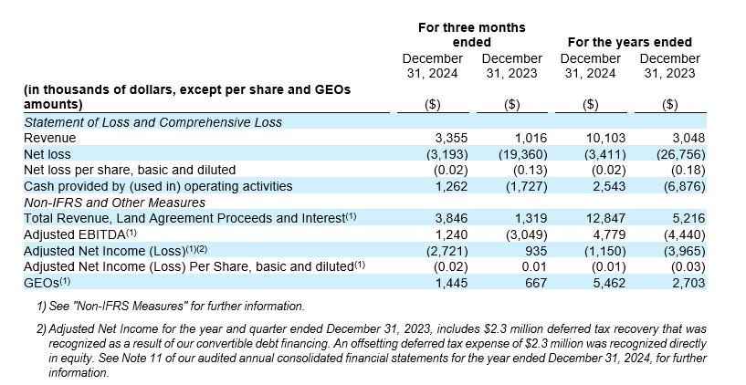 *Total Revenue, Land Agreement Proceeds and Interest, Adjusted EBITDA, Adjusted Net Income (Loss), Adjusted Net Income (Loss) Per Share and GEOs are each non-IFRS measures and do not have a standardized meaning under IFRS. See "Non-IFRS Measures" for further information.