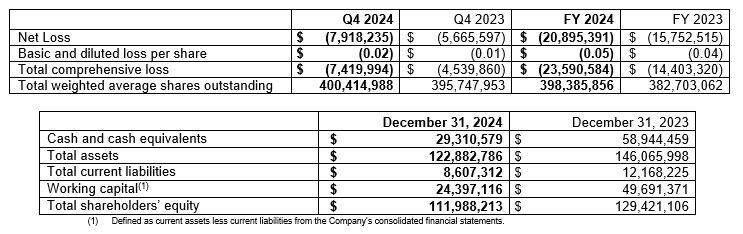 The following selected financial data is taken from the Company’s consolidated financial statements and related notes thereto (the “Financial Statements”) for the year ended December 31, 2024 and the Management’s Discussion and Analysis (“MD&A”) for the quarter and year ended December 31, 2024. The Company’s Financial Statements and MD&A are available at www.discoverysilver.com and on SEDAR+ at www.sedarplus.ca.