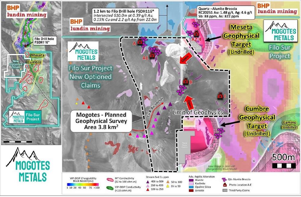Mogotes has initiated a large 3D vector IP/MT and deep penetrating IP/MT survey over newly optioned claims 1 km south of BHP and Lundin Mining’s Filo Del Sol Cu-Au-Ag deposit, to test for extensions of the Mogotes undrilled Meseta and Cumbre geophysical targets into Chile (see Figure 2 below).