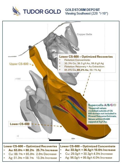 Commenting on the results, Ken Konkin, President & CEO of Tudor Gold stated, "We are very pleased with our second set of flotation test results obtained from the lower portion of the CS-600 Domain (CS-600L). We estimate more than 50% of the CS-600 Domain is located within the lower portion (the CS-600L subdomain). These latest results compared favorably with the first locked cycle test we announced on October 24, 2024. With a simple rougher-cleaner flotation process we are consistently able to produce an exceptionally clean, high-grade copper/gold concentrate with excellent metal recoveries and, significantly, we were able to recover more gold during the most recent metallurgical work with an additional leaching step. We conducted testing on the flotation tailings and pyrite concentrates by simply leaching these with cyanide. This added a substantial amount of gold, which increased the combined gold recovery to just over 80%. Our metallurgical team believes that continued fine-tuning of the process may continue to yield higher recoveries. Several tests demonstrated that higher gold recoveries were associated with finer grinds. These reported recoveries utilized a grind size of 75 microns. The CS-600L sub-domain is located in the same area that hosts the newly discovered Supercell-1 (SC-1) high-grade gold complex. Our technical team is currently completing elements of our next permit application to include the construction of an exploration ramp designed to intersect the area immediately adjacent to the CS-600 Domain and directly above the newly discovered SC-1 high-grade gold structures. The proposal is to construct a three-kilometer-long exploration ramp collared from our Lower Camp area that will allow us to more efficiently drill test the SC-1 complex. This is an important aspect of our Treaty Creek Project, as the added possibility of defining a highgrade, multi-million-ounce gold deposit would greatly enhance the economic potential of the project, since it would provide us with a much smaller Capex target to start the mine process.”