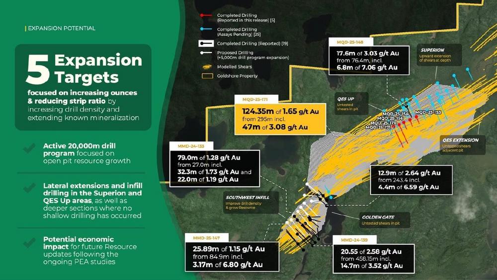 Die ersten drei Bohrungen (MQD-25-153, MQD-25-154, MQD-25-156) wurden innerhalb der mineralisierten QES-Hülle abgeschlossen, da die tieferen Abschnitte der Zone durch frühere Bohrungen ausreichend erprobt wurden.