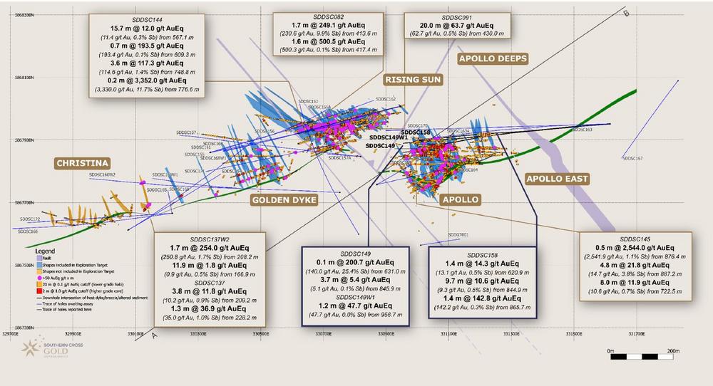 Die Mineralisierung in den Bohrlöchern, über die hier berichtet wird, wurde in einer Tiefe von 400 m bis 700 m vertikal unter der Oberfläche und 600 m unterhalb der Basis der historischen Mine Apollo durchteuft. Die drei Bohrlöcher gehören zu den tiefsten Ost-West-Bohrlöchern bei Apollo und stellen eine 80 m bis 120 m neigungsabwärts verlaufende Erweiterung von sechs hochgradigen mineralisierten Bereichen dar. Zwei Abschnitte von SDDSC158 übersteigen 100 Gramm AuEq und ein Abschnitt von SDDSC149W1 >50 Gramm AuEq
