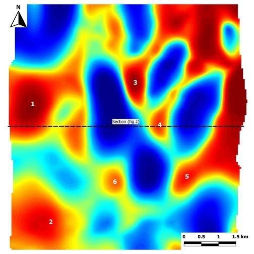The new inversion data has confirmed the presence of six high-conductivity anomalies as shown in Figure 1. These conductive anomalies typically begin 250 metres from the surface and exhibit deep roots as seen in Figure 2. These anomalies are significant since zones of elevated conductivity often correlate with porphyry copper deposits due to the presence of electrically conductive sulphide minerals (pyrite, chalcopyrite and bornite) and porphyry-related alteration (phyllic and argillic zones).