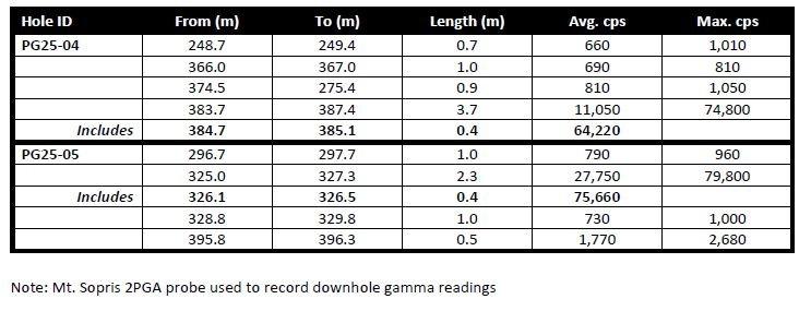 A Mount Sopris 2PGA-1000 downhole total gamma probe was utilized for radiometric surveying. The total gamma results provided in Table 1 were selected using a cutoff of 500 cps over a 0.5 metre width. All drill intercepts are core width and true thickness is yet to be determined.