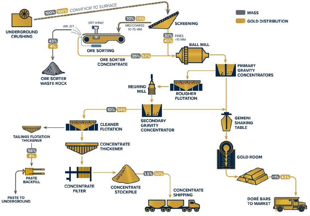 Das Programm, das vom Saskatchewan Research Council (SRC") mit Unterstützung von TOMRA Sorting (TOMRA") in der SRC-Testanlage in Saskatoon, Saskatchewan, Kanada, durchgeführt wurde, verwendete einen Röntgentransmissionssensor (XRT"), um~ 80 Tonnen aufgespaltenes Material (repräsentativ für eine ~400 Tonnen schwere Schüttgutprobe) mit einer TOMRA COM 1200 Tertiary XRT-Maschine im Produktionsmaßstab zu bewerten. Der Vorkonzentratkreislauf des Erzsortierers im FS 2025 ist so konzipiert, dass ein XRT-Sensor verwendet wird, um nicht mineralisierten Sandstein (Abfallgestein) von goldhaltigem Sulfidmaterial (metallhaltigem Gestein) anhand der atomaren Dichte zu trennen. Da der XRT-Scanner Sulfidmaterial mit hoher Dichte und Abfallgestein mit geringer Dichte erkennt, kann er mit geringen Kosten von etwa 1 bis 2 C$ pro Tonne selektiv marginales Material von der nächsten Verarbeitungsstufe abtrennen und gleichzeitig ein überwiegend nicht potenziell säurebildendes (NPAG") Abfallprodukt erzeugen.