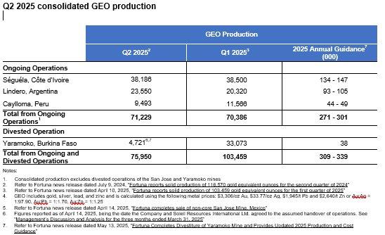 Fortuna delivers production of 71,229 gold equivalent ounces from ongoing operations for the second quarter of 2025