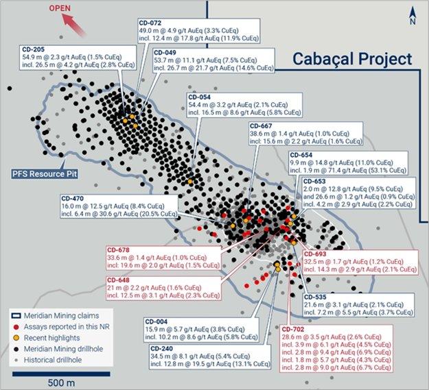 Meridian Mining UK S (TSX: MNO), (Frankfurt/Tradegate: 2MM) (OTCQX: MRRDF) (- https://www.commodity-tv.com/play/meridian-mining-work-begins-on-the-definitive-feasibility-study-for-cabacal/ -) (“Meridian” or the “Company”) is pleased to report the delineation of multiple stacked layers of Au-Cu-Ag ore, drilled at its advanced Cabaçal Au-Cu-Ag VMS project (“Cabaçal”). Results included CD-702’s 28.6m @ 3.5g/t AuEq (2.6% CuEq) from 127.6m, in the more sparsely drilled southeastern sector of the Cabaçal PFS[1] open-pit. Stronger than expected zones of copper ore have been encountered here that are expected to improve local grade continuity. Today’s results provide further data to improve both grade and density modelling, as Cabaçal DFS’s infill drilling program nears its final stages. Drilling continues and more results are pending.