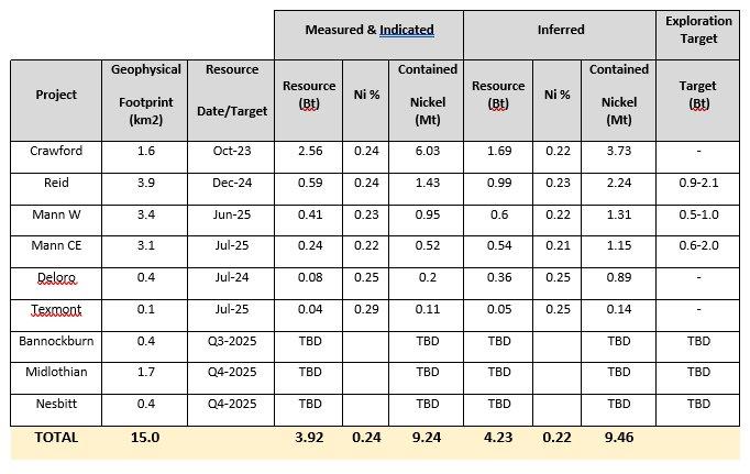 The Mann Central Project is only 23 km east of the Company’s Crawford Nickel Sulphide Project (“Crawford”) and is more than twice the size of Crawford based on the outline of its geophysical target of 3.1 square kilometres. The area of the geophysical target covered by the Mann Central MRE represents approximately 40% of its total target geophysical area. Mann Central is accessible year-round.