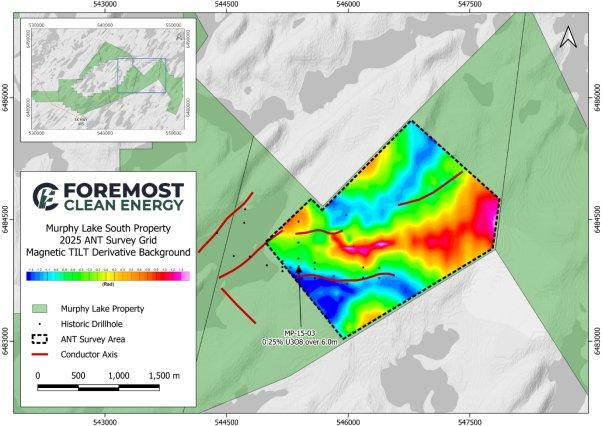 Foremost Clean Energy Ltd. (NASDAQ: FMST) (CSE: FAT) (FRA:F0R WKN: A40Z8P) („Foremost“ oder das „Unternehmen“) gibt bekannt, dass es Caur Technologies Inc. („Caur“) mit der Durchführung einer Ambient Noise Tomography („ANT“)-Untersuchung auf dem Uranprojekt Murphy Lake South („Murphy“) des Unternehmens im weltbekannten Athabasca-Becken im Norden der Provinz Saskatchewan beauftragt hat. Die ANT-Untersuchung soll die Ziele entlang eines vielversprechenden Trends von übereinanderliegenden, graphithaltigen Leitern verfeinern, die mit bekannten Diskordanzversätzen südlich von MP-15-03 (0,25 % U₃O₈ über 6,0 m) in Verbindung stehen. Viele der einzelnen Leiter innerhalb dieses übereinanderliegenden Systems wurden noch nicht ausreichend erkundet. Die Untersuchung zielt auch darauf ab, neue Ziele entlang der von magnetischen und EM (Elektromagnetik)-Daten definierten, in Ost-West- und Nord-Ost-Richtung verlaufenden strukturellen Korridore zu generieren, die bisher durch historische Bohrungen kaum erkundet wurden (siehe Abbildung 1).