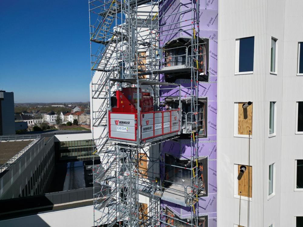 To ensure fast and efficient material transport, modern sites like these have a high demand for specialized solutions. The tower cranes in use need to be relieved when lifting and installing the façade elements, and there is a general demand to provide a proper solution for transporting personnel. To address this, the company Verhelst from Ostend in Flanders positioned two GEDA 2500 Z/ZP transport platforms at different points on the construction site. The machine’s high load capacity and its ability to be loaded sideways across its full width using a forklift were decisive advantages. Especially during the interior construction of the hospital, which involved a large amount of palletized building material, the 2.5-ton machines proved highly effective. Since the special façade design did not allow for direct anchoring of the machines, they were anchored inside the building using a steel structure that extended through the window openings. Thanks to Verhelst’s precise planning and close cooperation with GEDA, this challenge was ultimately mastered successfully.