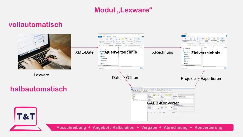 Um diesen Problemen aus dem Weg zu gehen, hat die T&T Datentechnik GmbH Ihre Software „GAEB-Konverter“ um eine neue Funktionalität erweitert. Mit Hilfe des Moduls "Lexware" können Angebots- und Rechnungsdaten aus Lexware oder anderen Systemen entweder vollautomatisch oder halbautomatisch in eine XRechnung umgewandelt und lokal gespeichert werden.