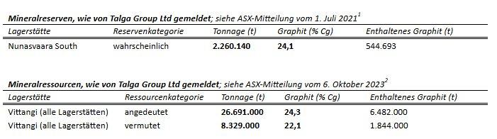 2Anmerkungen zu den Mineralressourcen. Die Mineralressourcen von Vittangi wurden von Talga in seiner ASX-Pressemitteilung vom 6. Oktober 2023 veröffentlicht. Alle Mineralressourcen wurden gemäß den Berichtsrichtlinien des JORC-Codes 2012 gemeldet, der gemäß NI 43-101 als ausländischer Code anerkannt ist. Angedeutete Mineralressourcen werden innerhalb vorläufiger Grubenumrisse und oberhalb eines Cutoff-Gehalts von 12,5 % Cg unter Verwendung eines Graphitpreises von 5.000 US$/t gemeldet. Die gemeldeten Ressourcen verstehen sich einschließlich der Reserven. Aufgrund von Rundungen können sich bei der Summierung Fehler ergeben. Wie von Talga berichtet, war die qualifizierte Sachverständige, die die Mineralressourcenschätzung beaufsichtigt hat, Frau Katharine Masun (HBSc Geologie, MSc Geologie, MSA Spatial Analysis), die zum Zeitpunkt der Veröffentlichung als leitende Geologin bei SLR Consulting (Canada) Limited tätig war. Zum Zeitpunkt der Veröffentlichung war Frau Masun außerdem als professionelle Geologin in den Northwest Territories und Nunavut, den Provinzen Ontario, Neufundland und Labrador sowie Saskatchewan (Kanada) registriert und ist eine sachkundige Person im Sinne des JORC-Codes.