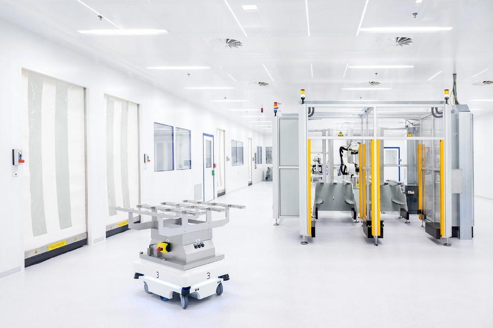 Die neu geschaffene, 222 m2 große Reinraumfläche ergänzt die bestehenden 650 m2. Hochmoderne Spritzgussmaschinen mit Schließkräften von bis zu 900 t sowie ein innovatives Maschinenkonzept mit eingekapselter Schmierung gewährleisten, dass auch großformatige Pharmaverpackungen unter höchsten Sauberkeitsstandards produziert werden können. Die präzise Fertigung in DIN EN ISO Klasse 7- und GMP-konformen Räumen bietet Kunden damit noch höhere Produktsicherheit und Zuverlässigkeit. Die im Spritzguss gefertigten Teile werden von Robotern dem Werkzeug entnommen, von einer Kamera geprüft und dann gestapelt. Fahrerlose Transportsysteme (FTS) überführen sie autonom und sicher an die Verpackungsmaschine.