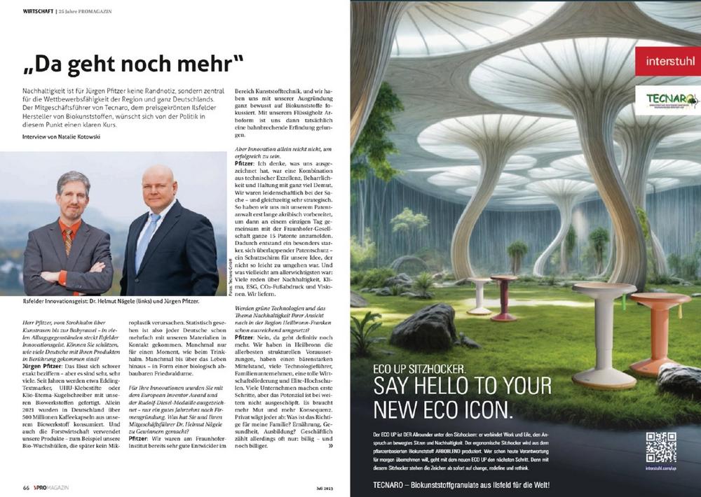 Ein weiteres Highlight auf Seite 45 – Gemeinsam mit Marktführer @Interstuhl setzt TECNARO in dieser Ausgabe mit der ersten gemeinsamen Anzeige des nachhaltigen „ECO UP Sitzhocker aus ARBOBLEND“ auch werblich ein starkes Zeichen – für Innovation, regionale Verantwortung und „gesundes, ergonomisches Sitzen – Made in The Länd“.