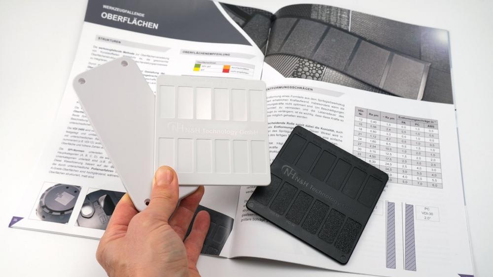 Zusätzlich zu den beiden Musterkarten enthält das Set den umfassenden „Design Guide Kunststoffformteile“. Dieser liefert praxisbewährte Hinweise zu Wandstärken, Entformungsschrägen, Verzug, Oberflächenveredelungen und Werkzeugkonzeption – eine wertvolle Orientierungshilfe für die serienreife Produktentwicklung.