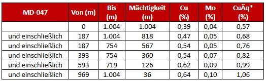 Vancouver, British Columbia – 30. Juli 2025 / IRW-Press / Copper Giant Resources Corp. („Copper Giant” oder das „Unternehmen”) (TSXV: CGNT, OTCQB: LBCMF, FWB: 29H0) freut sich, die vollständigen Analyseergebnisse für Bohrung MD-47 bekannt zu geben, die aufgrund der Bohrkapazität und der durch die Keilinstallation eingeschränkten maximalen Reichweite in einer Tiefe von 1.004 Metern beendet wurde. Die Bohrung ist Teil des 14.000 Meter umfassenden Programms des Unternehmens zur Erweiterung der Ressourcen auf seinem Porphyr-Kupfer-Molybdän-Vorzeigeprojekt Mocoa in Putumayo, Kolumbien. MD-47 hat den hochgradigen Kern des Systems in die Tiefe erweitert und die Ausrichtung der massiven Kupfer- und Molybdänmineralisierung bestätigt. Die Bohrungen werden mit zwei Bohrgeräten, die mit voller Kapazität arbeiten, aktiv fortgesetzt.