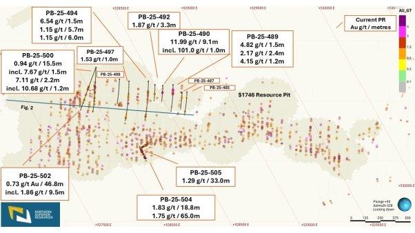 Zwei Bohrlöcher wurden mit derselben Anordnung etwa 600 m westlich von PB-25-490, leicht abseits des Hauptazimuts, fertiggestellt, um die Kontinuität der Mineralisierung innerhalb der Hangenden-Zonen im westlichen Teil der Grube zu untersuchen. PB-25-502 ergab einen breiten Abschnitt mit 0,73 g/t Au über 46,8 m, einschließlich eines höhergradigen Abschnitts mit 1,86 g/t Au über 9,5 m, was das starke Potenzial für eine kontinuierliche, oberflächennahe Mineralisierung unterstreicht. PB-25-500 durchteufte 0,94 g/t Au über 15,5 m, einschließlich 7,67 g/t Au über 1,5 m, sowie weitere hochgradigere, schmalere Abschnitte wie 7,11 g/t Au über 2,2 m und 10,68 g/t Au über 1,2 m.