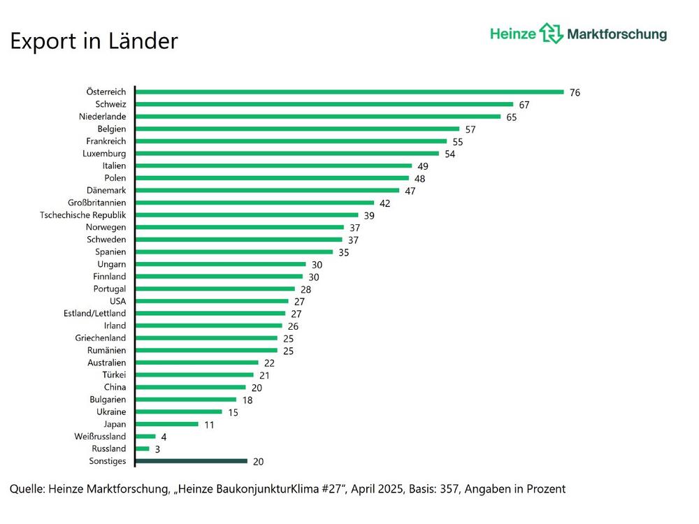 Eine weitere Erkenntnis der Untersuchung ist, dass sich das Exportgeschäft geografisch verschiebt. Während der Absatz in Märkten wie Russland (–38 %) oder Großbritannien (–17 %) deutlich zurückging, konzentrieren sich deutsche Hersteller vermehrt auf stabile, gut erreichbare Zielmärkte innerhalb Europas. An der Spitze der Exportländer stehen weiterhin Österreich, die Schweiz sowie die Benelux-Staaten.